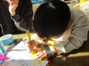 今朝、テラスでせいび音の日で踊る時に纏う衣装を作っていたうみ(3歳児)とあおぞら(4歳児)。 各クラスが外の日に使ったいくつもの手裏剣。これらを引き継ぎ、ブレスレットやヘアバンドを作っていたのだ。「じゃあ今日はそれを […]