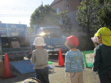 ゴミ収集車がせいびにやって来た。すぐに気がついて、園庭から駐車場を見つめる。働く車の中でも身近で、人気がある『ゴミ収集車』。今日はゴミの分別について教えていただいたり、ゴミ収集車にゴミを投げ込む体験ができるとあって、子 […]