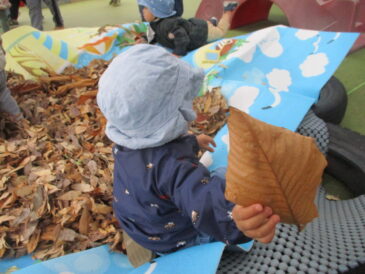 まだ、登園している子どもも少ない朝の時間。保育者が洗濯物を干そうとテラスに出ると、日除けネットに立派なバッタがくっついているのを発見した。さっそく子どもたちに伝えると「えー!どこどこ!」と駆け寄ってくる。 保育者がバ […]