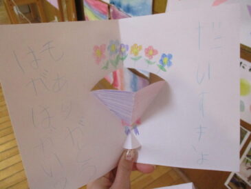 今日の朝の時間も「粘土したい。」と言う声があがったので、一昨日使った紙粘土の残りを出した。初めは感触を楽しむようにこねていたのだが、1人の男児が型抜きでクッキーを作り始めると、周りも顔の形のパンや、メロンパン、ケーキ、 […]