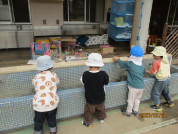 園庭に降りていくと砂場の一角に、枯れ木を砂場に刺した植木のようなものができていた。きっと朝の時間にかぜグループのお兄さん、お姉さんが作ったものなのだろう。 それを見つけると「何これ?」「木が出てきたの?」「お水あげた […]