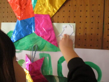 先日、岩瀬先生とクリスマスツリーを作った子どもたち。今日はその周りに飾れるものを作れたらと、靴下とクリスマスツリーの形に切った画用紙を用意しておいた。 「ここ(製作コーナー)にあるの、好きなの使っていいよ〜」と声をか […]
