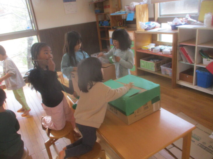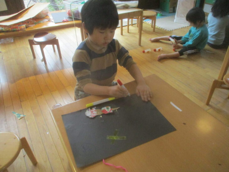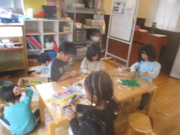 また、昨日の夕方にクリスマスツリーを手裏剣タワーと同じように作ってみたらいいのではと、北原先生に作り方を聞き、作り始めていた子どももいた。これを作りたいという気持ちが伝わってくる。その続きを「手伝って。」と友だちと一緒に取り掛かる。