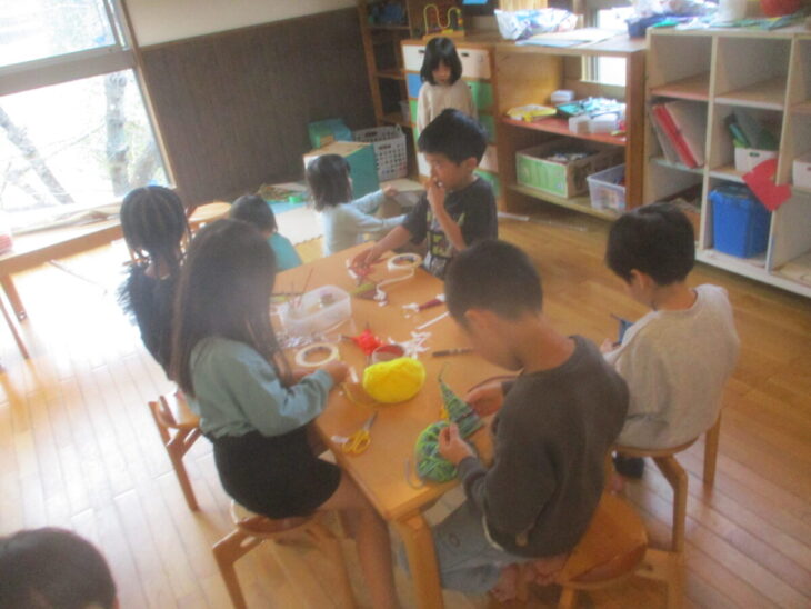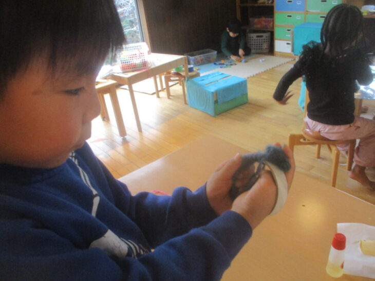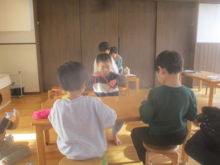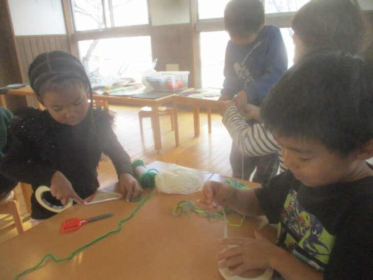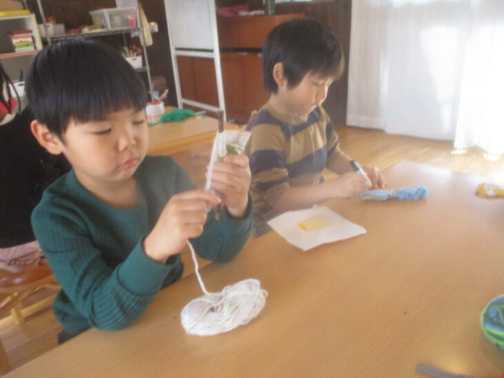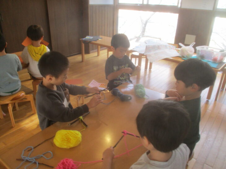 また、「これ作ってみる!」と木の枝に毛糸を巻きつけるが、そのやり方が分からないと、「こうやるんだよ。」と、声を掛けてくれるとり(5歳児)。その姿に頼もしく感じる。そして、それを見たり聞いたり、少しやってもらったりするあおぞら(4歳児)。コツを掴むまでは悪戦苦闘していたが、分かると黙々と作っている。