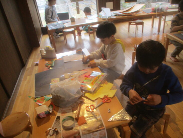 隣のテーブルでは、「看板作ったよ〜。」と教えてくれた。子ども同士で「これはこうなんだ。」「俺はこっちにこうした。」「こうする方が面白いな。」「どうやって立たせようか。」など、話をしながら作っている雰囲気がとてもいいなと感じた。