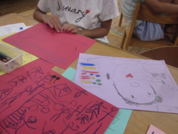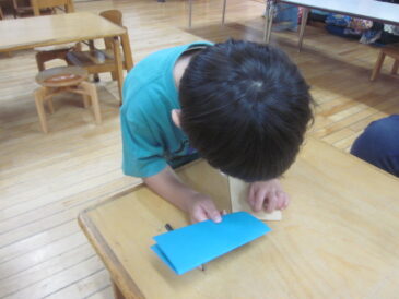 昨日、今日は輪投げをしようと話していたのだが、朝からあいにくの雨。楽しみにしていた輪投げができないと肩を落としながら保育室に入ると、既に登園していた数名が手裏剣作りをしていた。 第一声は「キラキラの折り紙ちょうだい! […]