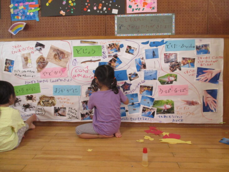 大きな白いロール紙を広げ、子どもたちが切り出した写真の傍に保育者がその名前などを書き込んでいくと、「こんな丸い目をしてんだ〜」と新たな発見したり、自分たちも映り込んだ前日の写真も出すと、「ヒトデはこうやってクルってしてた」と、昨日の感動を交わし始める。その言葉も紙面に書き込んでいくと、「全然動かなかったって書いて」といったリクエスト。その言葉からも、よく観察していたことが伝わってくる。