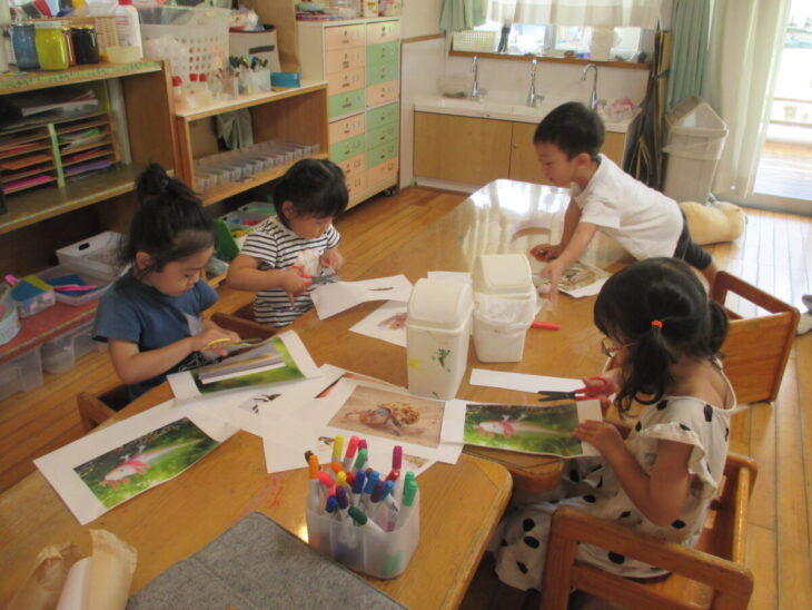 保護者会が準備してくれた「移動水族館」。前日のその興奮が冷めやらぬ3歳児。それを形にしてみようと、その時に見た生き物をパソコンで調べて印刷をしていくと、「切って貼ろう」と声が上がる。