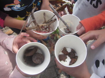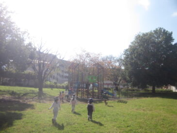 降っていた雨がタイミングよく上がり、曇り空ではあるものの戸外に出られそう。「明日芋掘りだよね。」「おにぎりの日でしょ〜!」「上柚木公園でおにぎり食べるんだっけ?」と明日の芋掘りが話題になると、「今日も上柚木公園行きたい […]