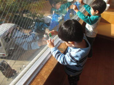 朝の時間、一人の男児が窓際に吊るしてあるサンキャッチャーに反射してできた虹を見つけて、「先生、ここに、にじがあるよ。」と声がかかる。「虹だね。あ、ここにも虹がある。」と別の場所の虹も指さすと、虹探しが始まった。 その […]