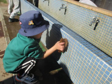 朝、「寒い寒い。」と呟きながら園庭に出てくる子どもたち。気温は低くても雲ひとつない空で日差しが暖かく感じる。 「先生、泥団子したいから出して。」と前日の続きを数名が始める。中にはまだ初心者の子もいて、「こうしてやるん […]